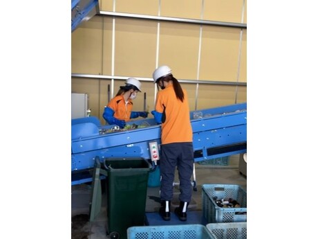 ここは、飲料用のビン・缶・PETボトルを機械で分別して再資源化を実現する工場です。また、発泡スチロールを圧縮して、再資源化します。